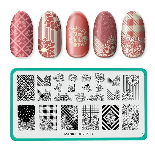 If you're in need of a bit of sunshine, our Petal Pusher (m118) XL Stamping Plate will instantly brighten your day! This extra-large stamping plate (4.75 in 1$\times$ 2.4 in) is bursting with good vibes, featuring lots of cheerful words and sayings to bring a touch of positivity into everything you do.2 Glow through what you go through with patterns inspired by vintage fabrics and beautiful spring florals.