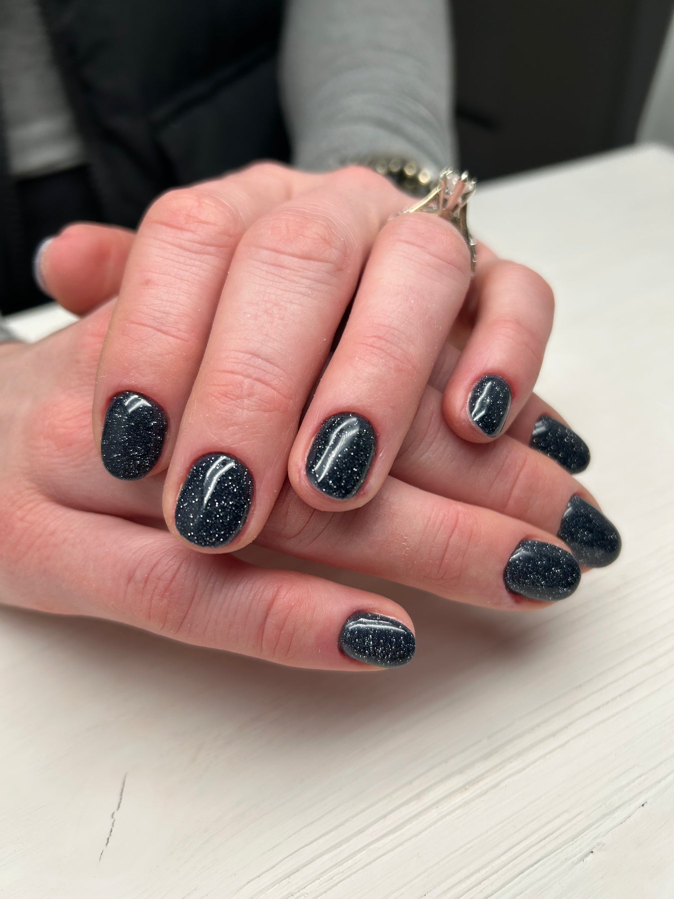 Close-up of a hand with dark glittery nail polish on a light surface shock effect 10 PNB