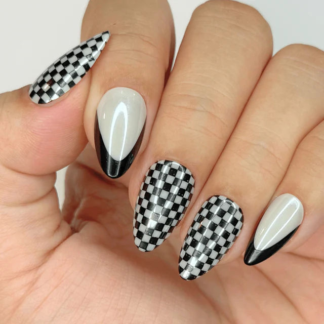 Classic Black & White: Stamp the classic checkerboard design over a white base using black stamping polish. This is an iconic look that provides high contrast and a bold statement.
