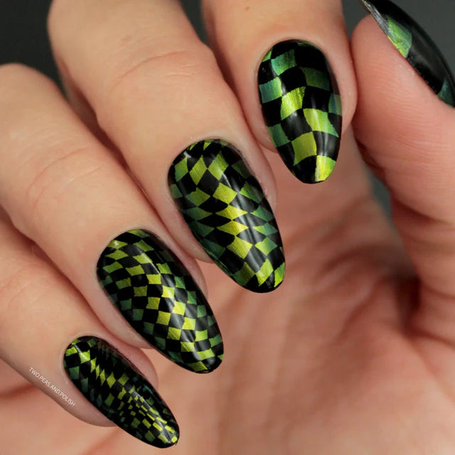 Wavy Statement: Use the wavy or distorted checker pattern with high-contrast colors (like neon green and black) for a fun, psychedelic, and eye-catching full-nail design.