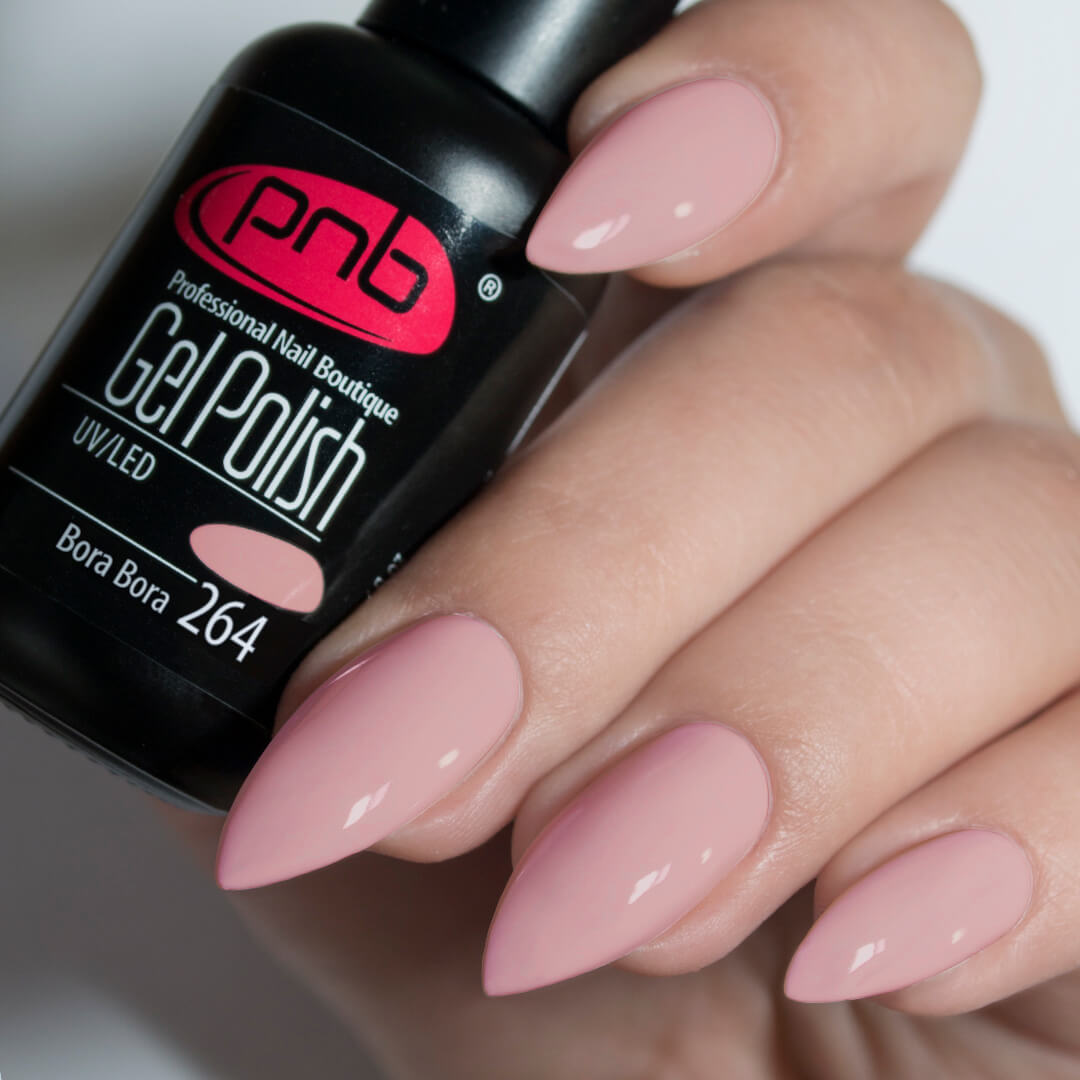 PNB Bora Bora 264 soft pink gel polish bottle and nail swatch with creamy nude-pink finish and glossy shine