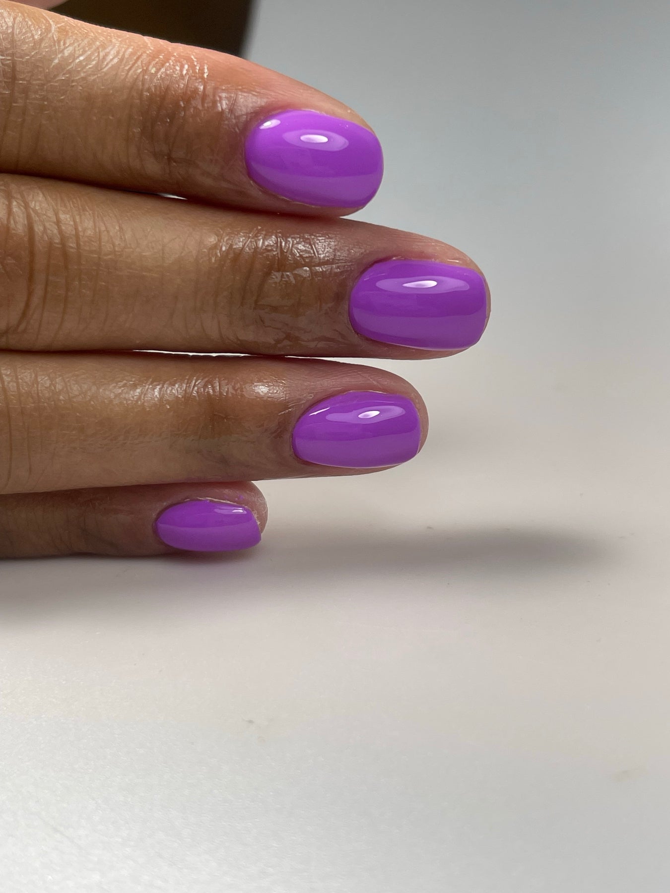 Bright purple gel polish on rounded nails with Russian manicure technique, glossy finish, and clean cuticle work