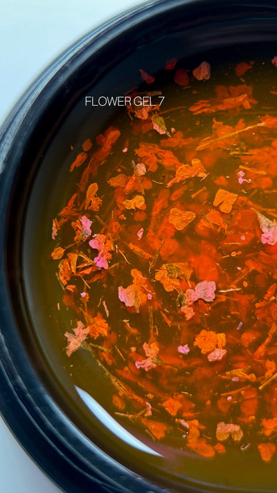 Real Dried Flower Fragments: Packed with authentic botanical elements, this gel creates a stunning organic texture. Against the orange background, the flowers look like they are preserved in warm resin.
