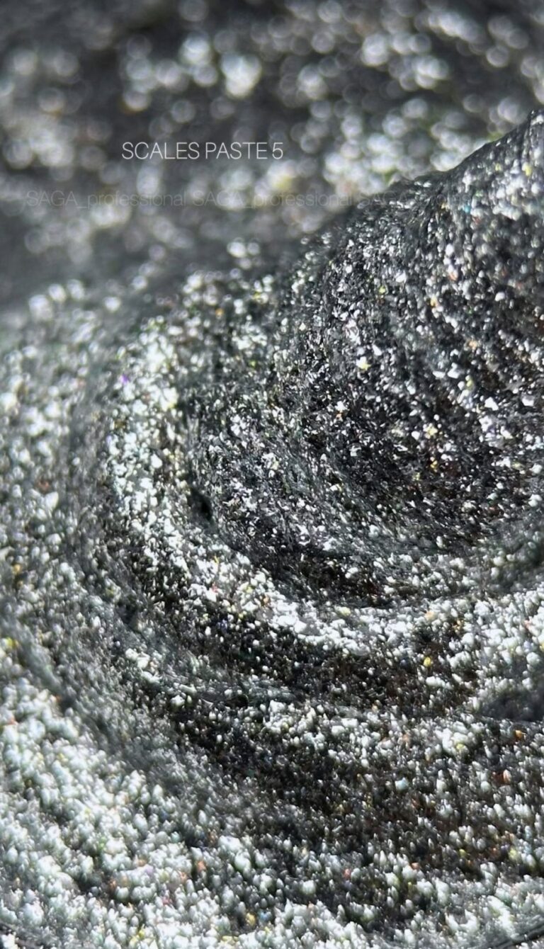 SAGA Scales Paste № 5 is a premium silver decorative gel paste engineered for creating sophisticated, high-impact nail art. This specialized material features a dense infusion of multi-sized glitters that mimic the look of iridescent pearl chips or shimmering scales, providing a brilliant pearlescent effect that shifts beautifully under different lighting.