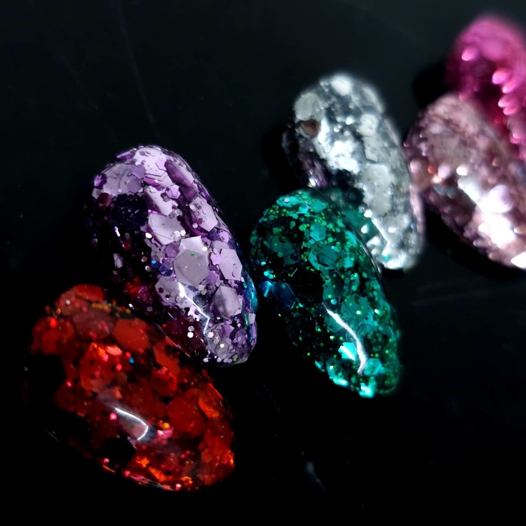 - Raspberry (Gel Nail Polish): Bold and juicy, raspberry glitter is perfect for making a statement. Art Inspiration: Use raspberry glitter to create a sparkling ombre effect, or pair it with black accents for a dramatic, edgy look.
