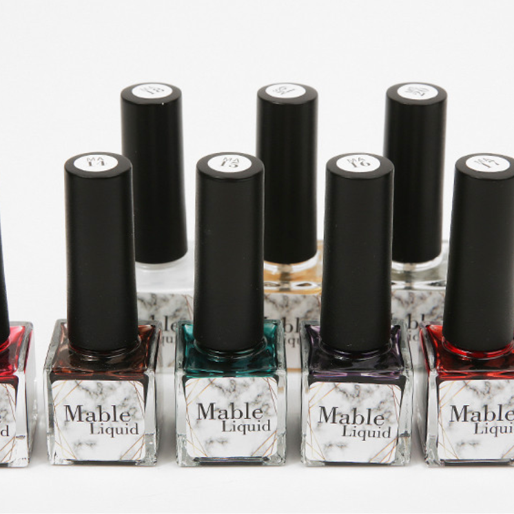 Mable Liquid nail polish collection in marble bottles, shades MA14-MA17 including teal, purple, red, and brown