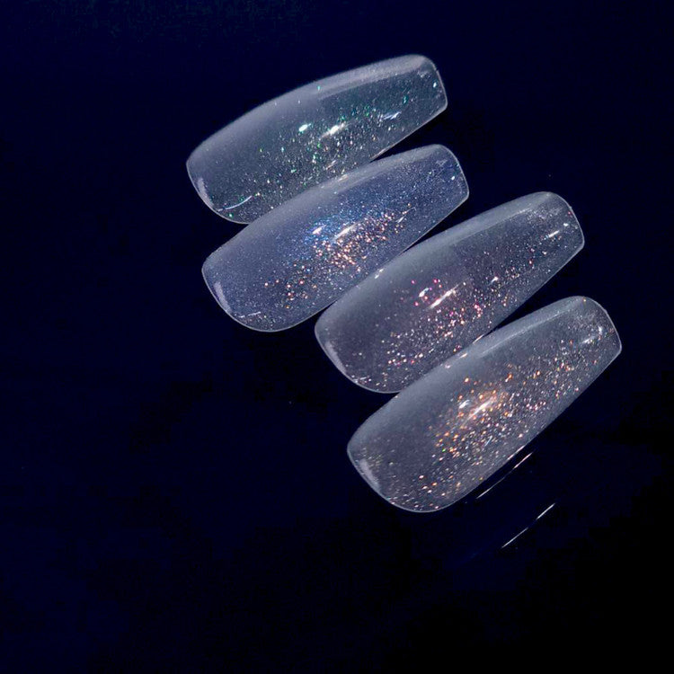 Our Angel Series is crafted with a transparent glitter base, infused with premium shimmer particles that create a unique, ethereal glow. Each shade offers a distinct sparkle, adding a touch of celestial magic to your nails: