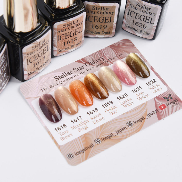 Journey through the cosmos with the Stellar Star Galaxy collection. This captivating set of seven cat eye gel polishes features a mesmerizing palette of fall and winter hues, perfect for creating celestial nail art that shines bright all season long.