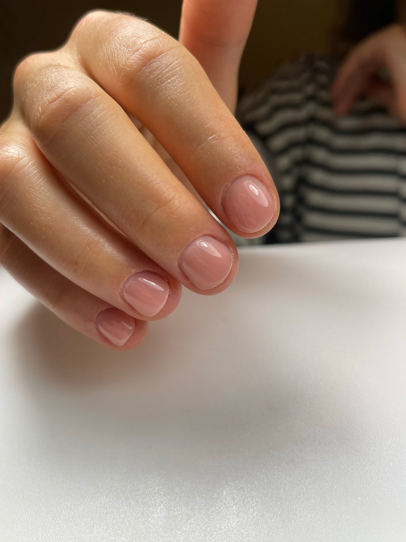 - Apply the first coat of Nude Peach Gel Nail Polish, ensuring full coverage.