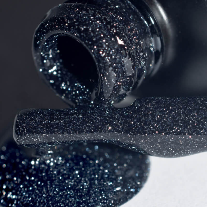 Close-up of a hand with dark glittery nail polish on a light surface shock effect 10 PNB