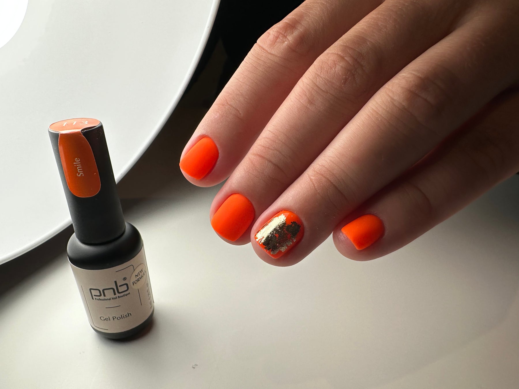 PNB Smile 113 orange gel polish with oval nail swatch showing glossy finish and professional manicure application