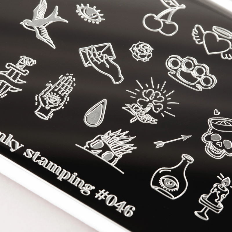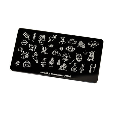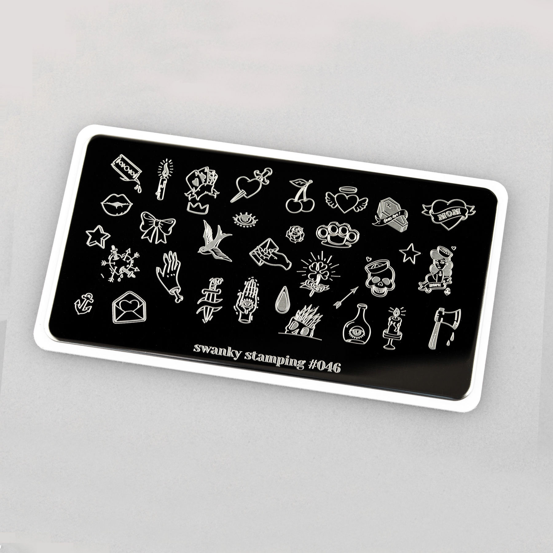 Designs on stamping plate: Pin up girl, Skull, Skulls, Hearts