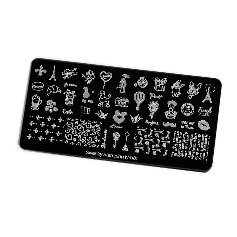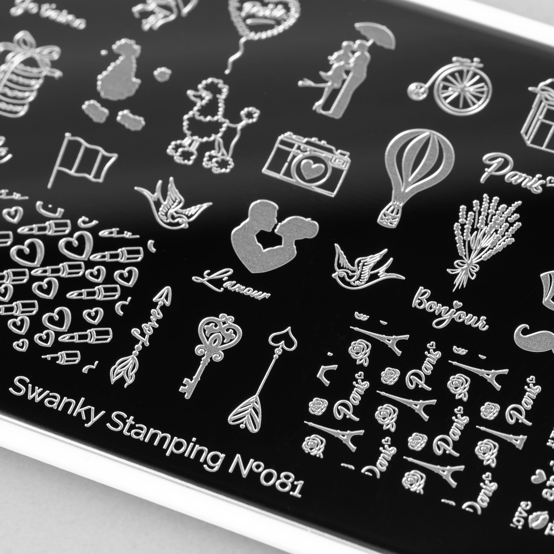 Designs on stamping plate: Eifel Tower, Hearts. Mime
